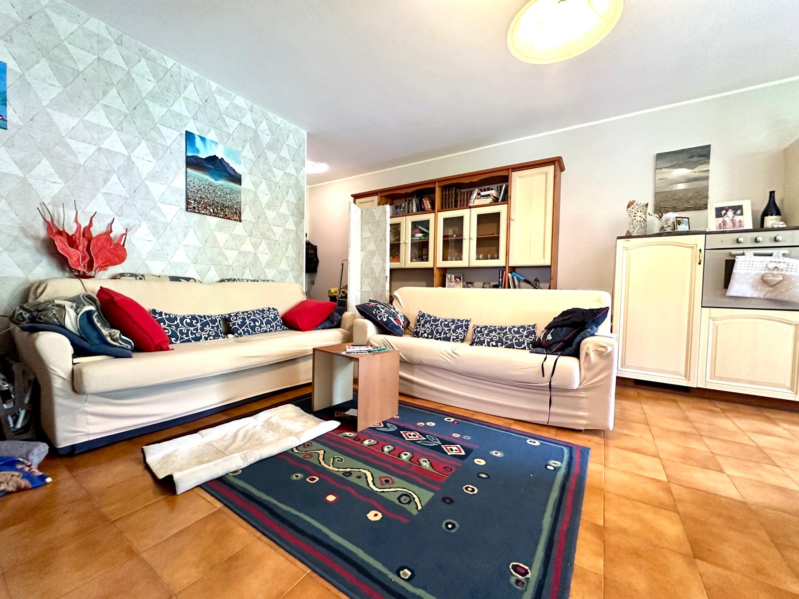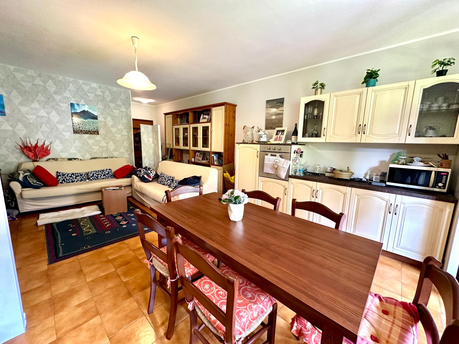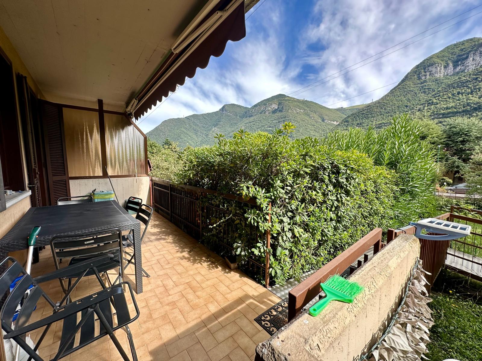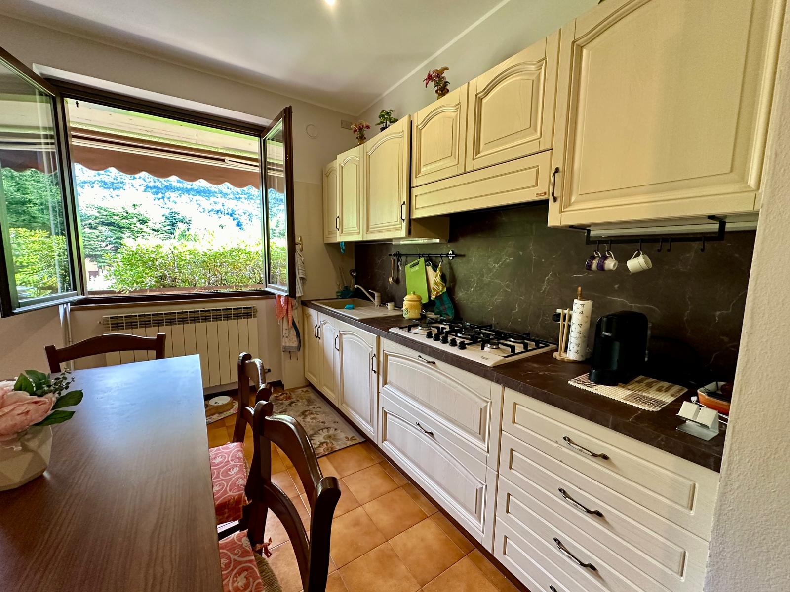 Piano terra: doppio ingresso, uno dalle scale ed uno direttamente dal terrazzo che affaccia sul giardino, ampio soggiorno con cucina a vista, due camere e bagno;