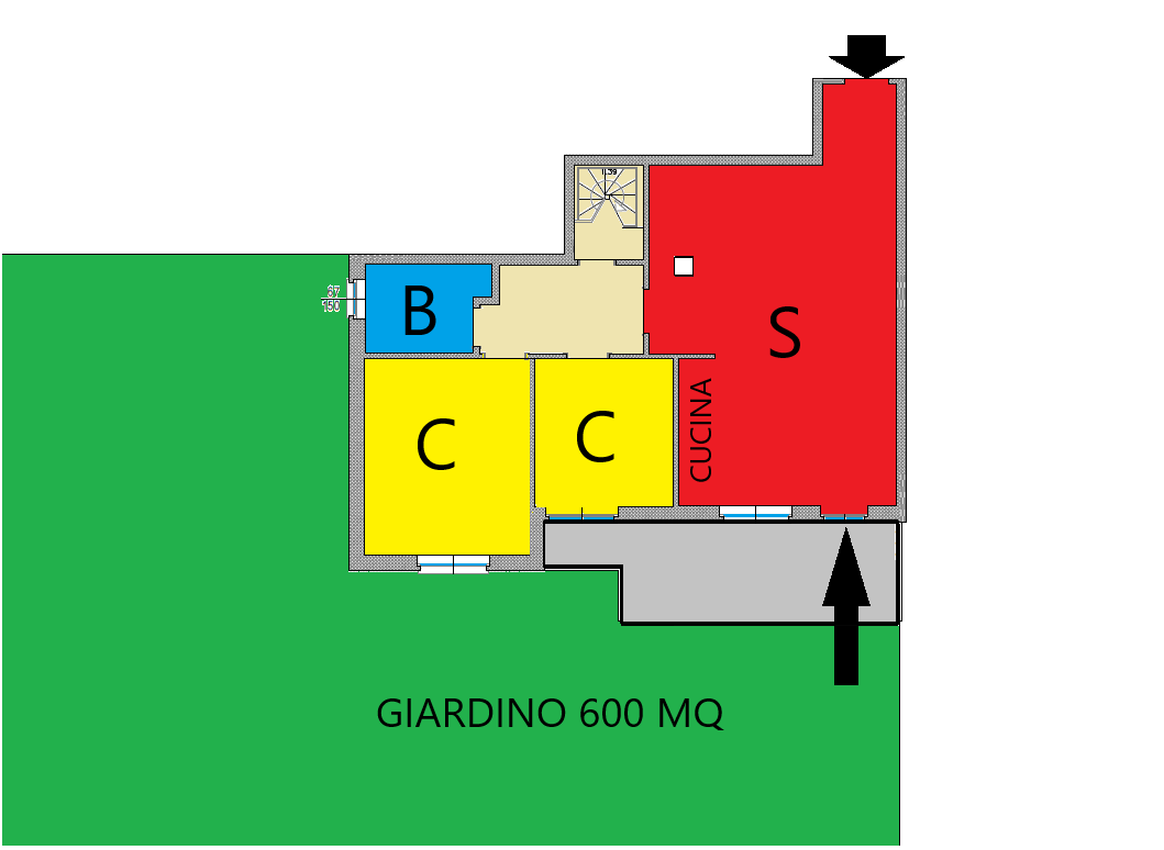 In un riservato condominio che riprende il contesto delle villette a schiera, proponiamo appartamento con giardino di circa 600 mq disposto su 2 livelli (di 75 mq ciascuno), come segue: