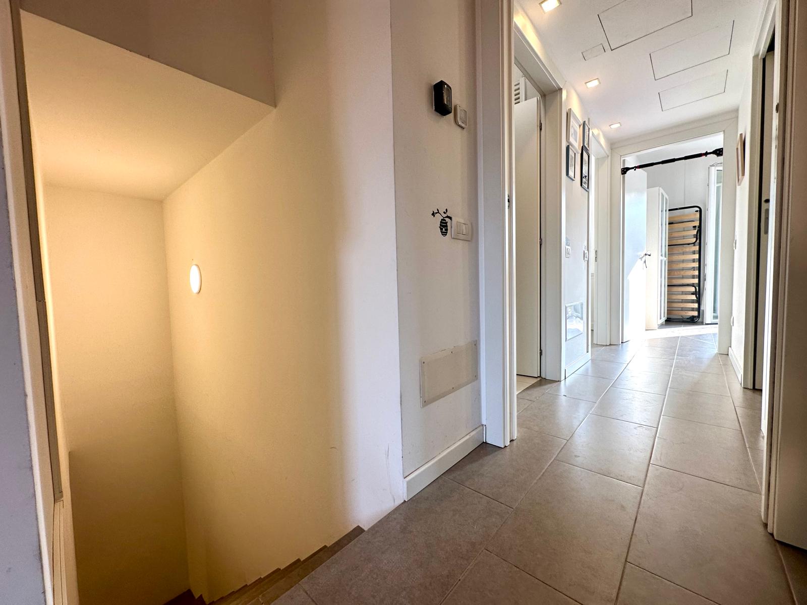 L’immobile, di recente costruzione ed in classe A+, si presenta in ottime condizioni ed è già abitabile. I pavimenti sono in gres ovunque, gli infissi interni sono in legno laccato e quelli esterni a taglio termico. La porta di ingresso è blindata. Nelle spese condominiali sono inclusi i costi per il riscaldamento ed il raffrescamento a pavimento, entrambi a consumo. Nella casa è presente l’impianto canalizzato per il ricircolo meccanico dell’aria. L’immobile è luminoso tutto il giorno in virtù della doppia esposizione est/ovest., la prima su strada la seconda su cortile interno. La taverna sita al piano interrato ha anche un cavedio che la rende separata dal terrapieno, quest’ultimo spazio oltre a rendere il locale asciutto viene ulteriormente sfruttato come deposito. Nel condominio ci sono poche unità abitative ed è tranquillo e riservato. Nel complesso è presente un impianto a pannelli fotovoltaici che rende le spese condominiali sono molto contenute.