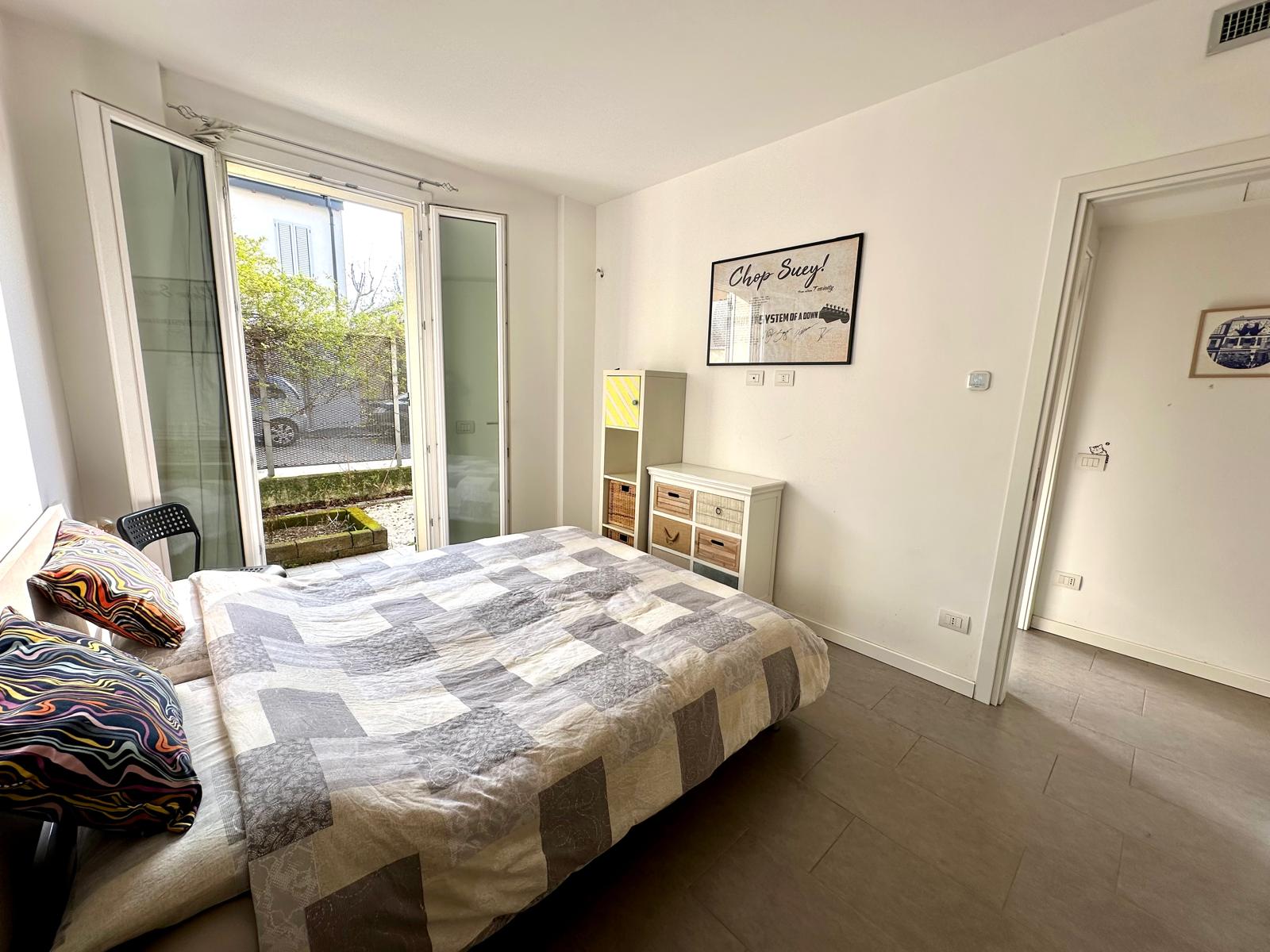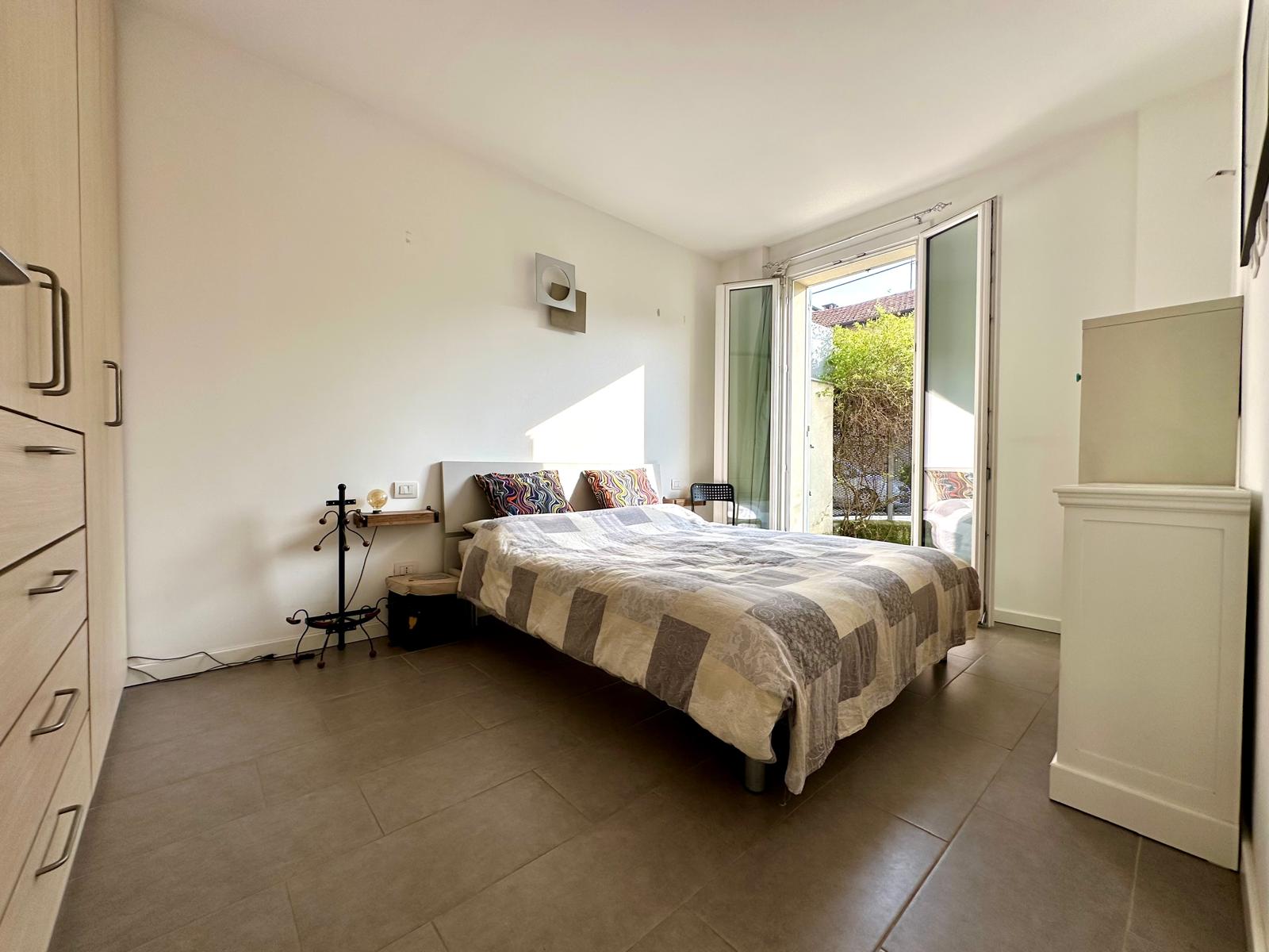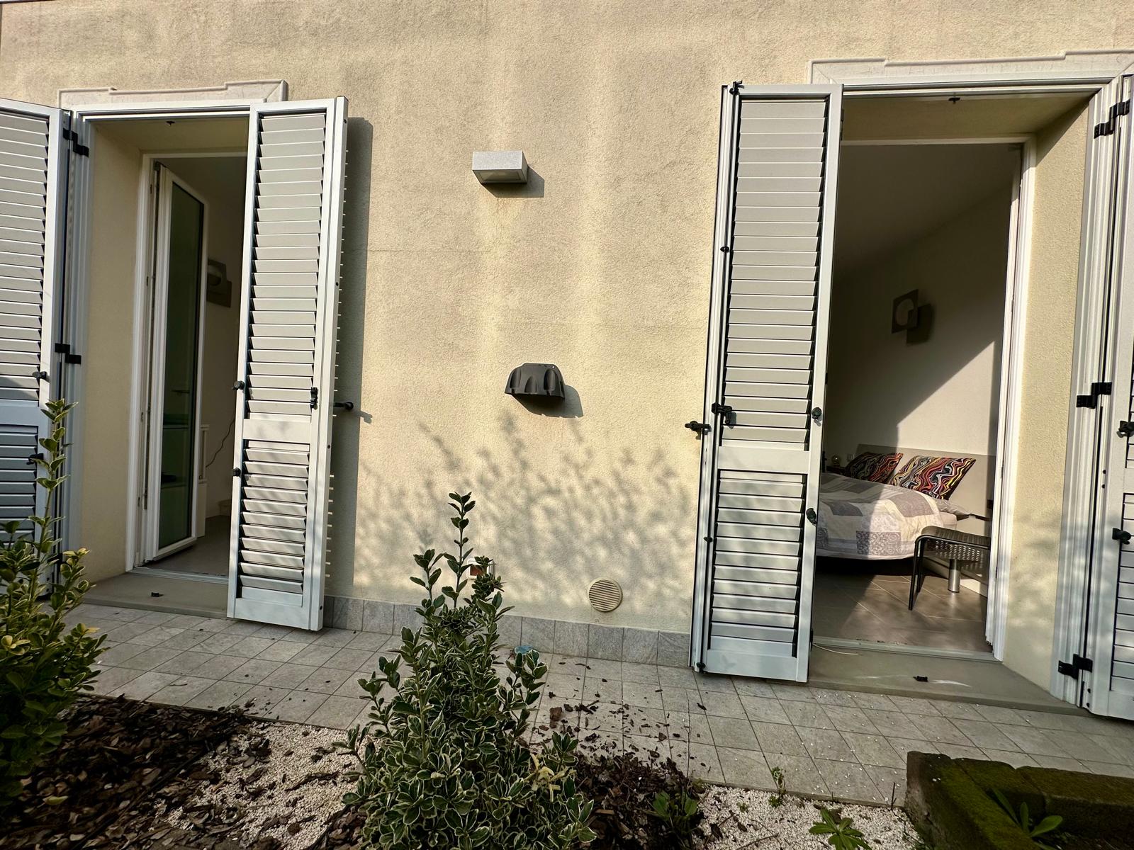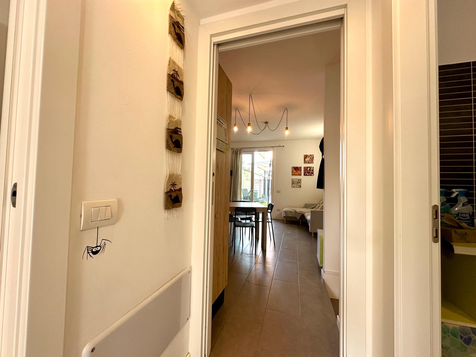 ingresso indipendente direttamente dal cortile tramite un cancelletto dove si accede al primo dei due giardini di proprietà. Dallo stesso si accede all’abitazione entrando nel soggiorno con cucina a vista collegato direttamente al giardino più ampio (40 mq). La zona notte, razionalmente separata dalla zona giorno, comprende due camere, che si affacciano entrambe sul secondo giardino, e due bagni, uno con vasca e uno con box doccia. Dal soggiorno, tramite scala interna si arriva al piano interrato, dove è presente un’altra stanza e un terzo bagno ad usa lavanderia. Nella proprietà sono inclusi due posti auto adiacenti al giardino.