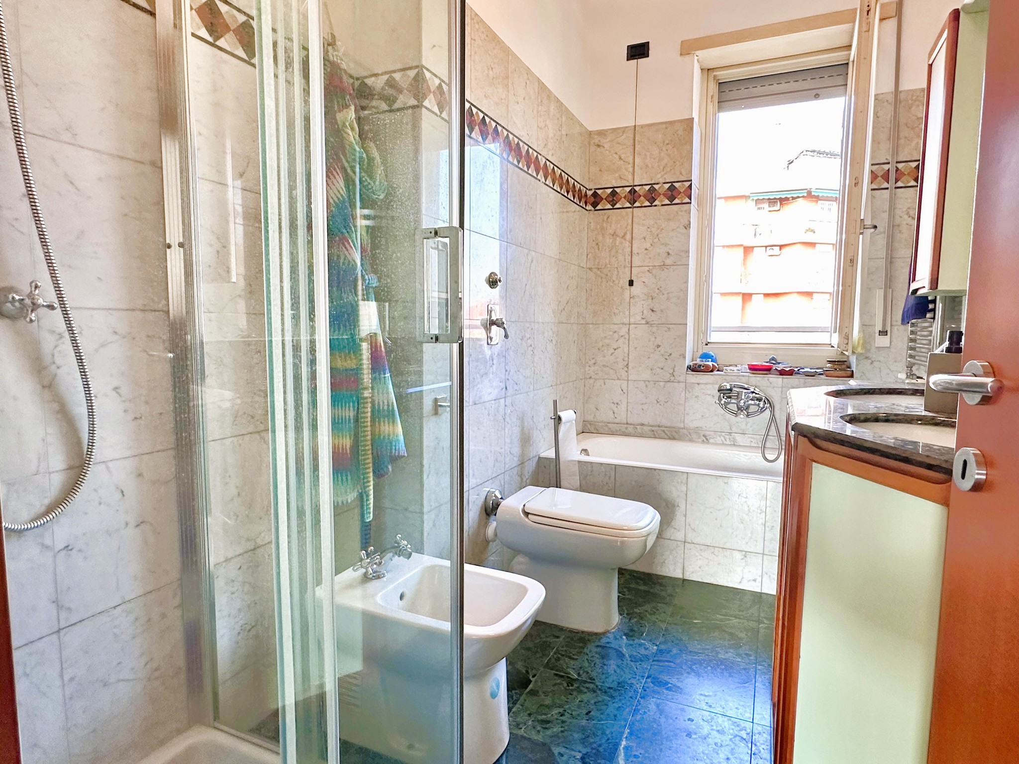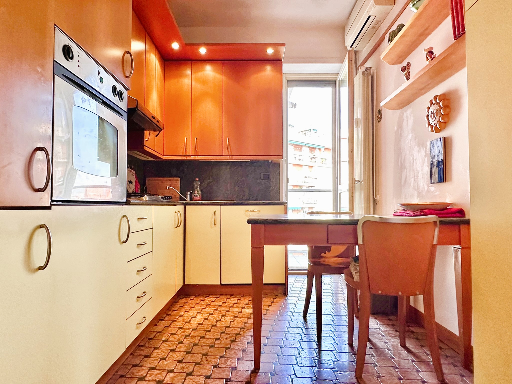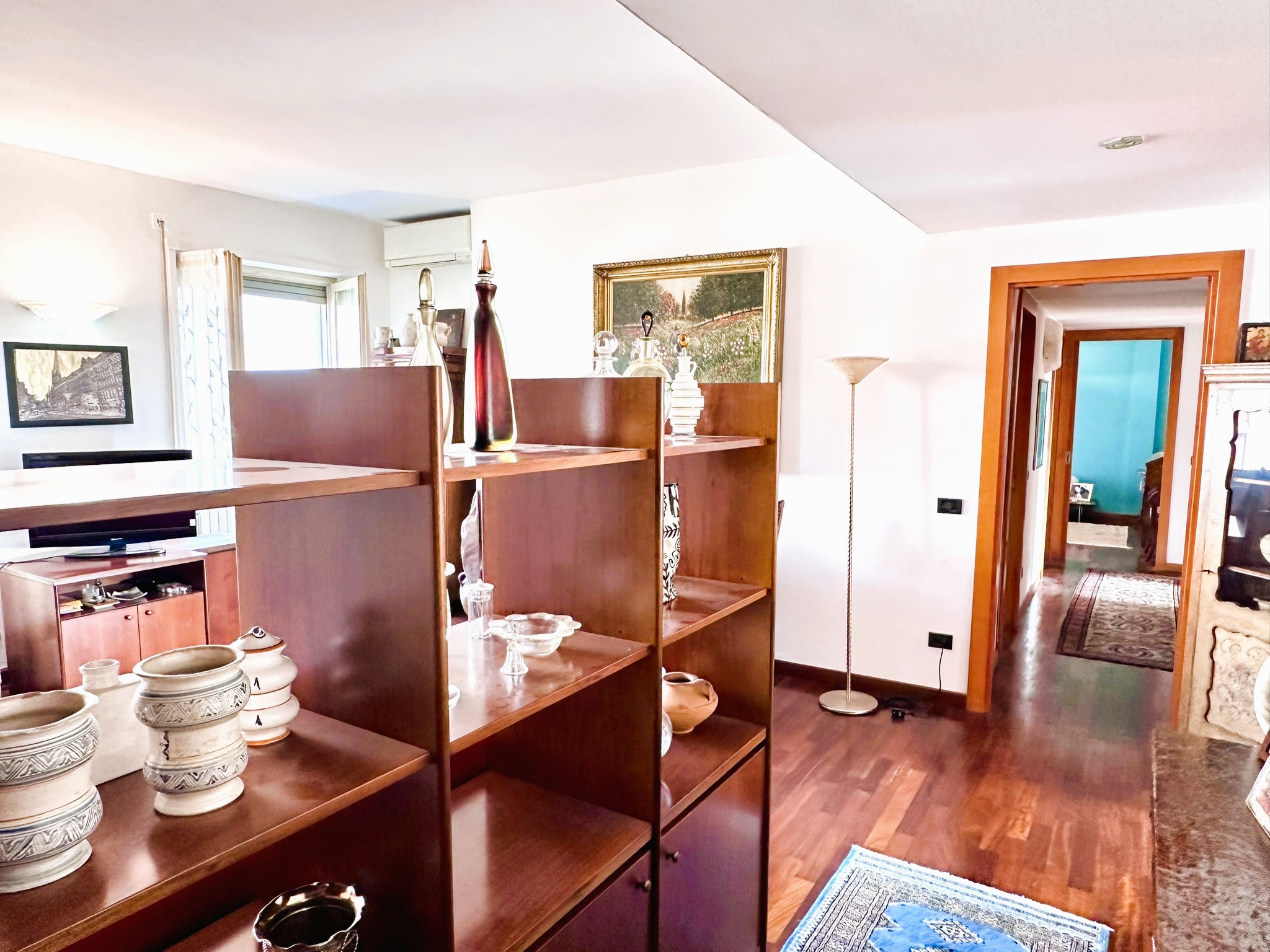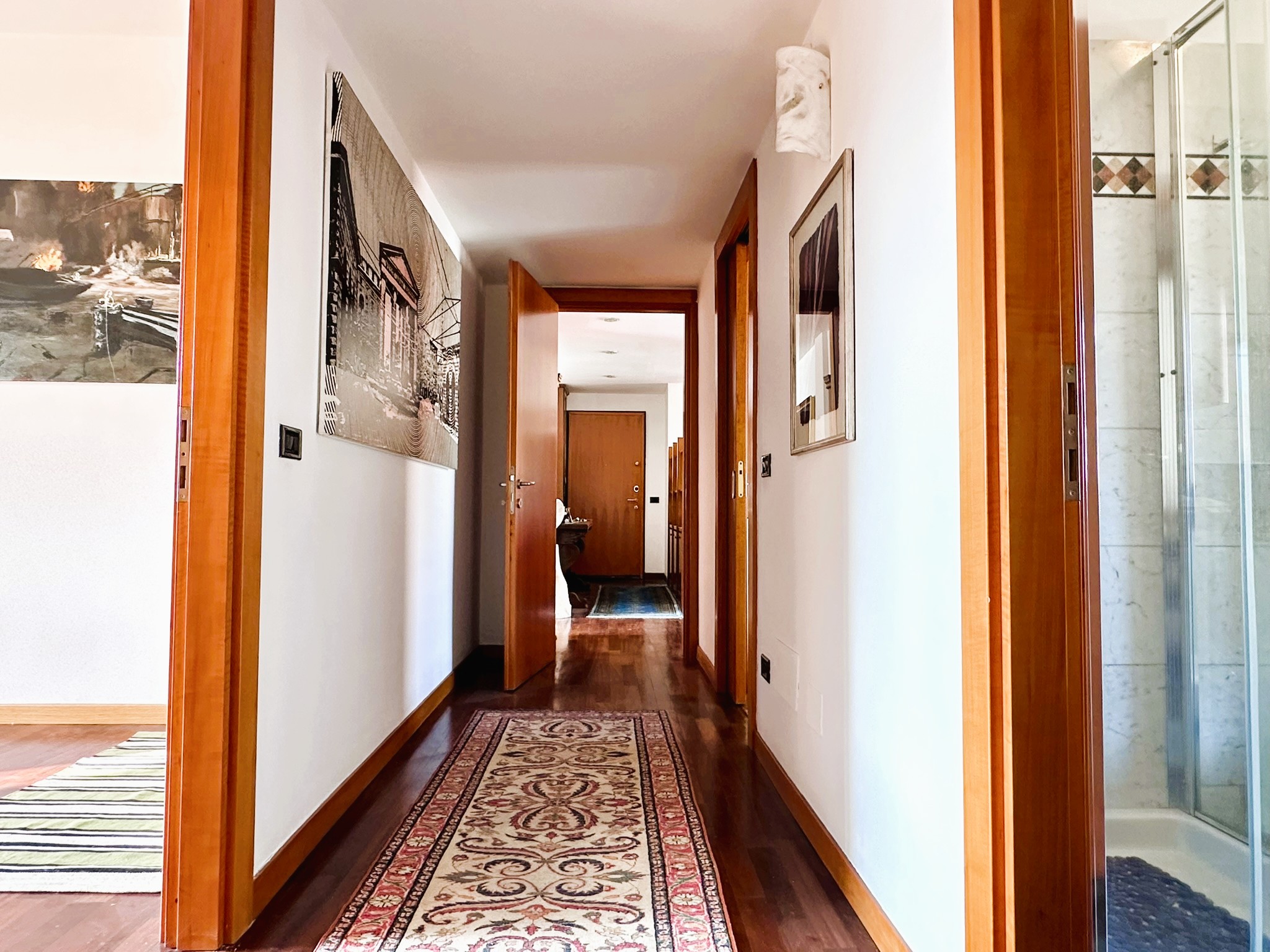 Pavimenti in parquet scuro di tipo Doussié ovunque, ad eccezione del bagno e della cucina dove è presente la ceramica. Scaldabagno elettrico nuovo, infissi esterni in legno con doppi vetri, aria condizionata, porte interne in legno, porta di ingresso blindata.