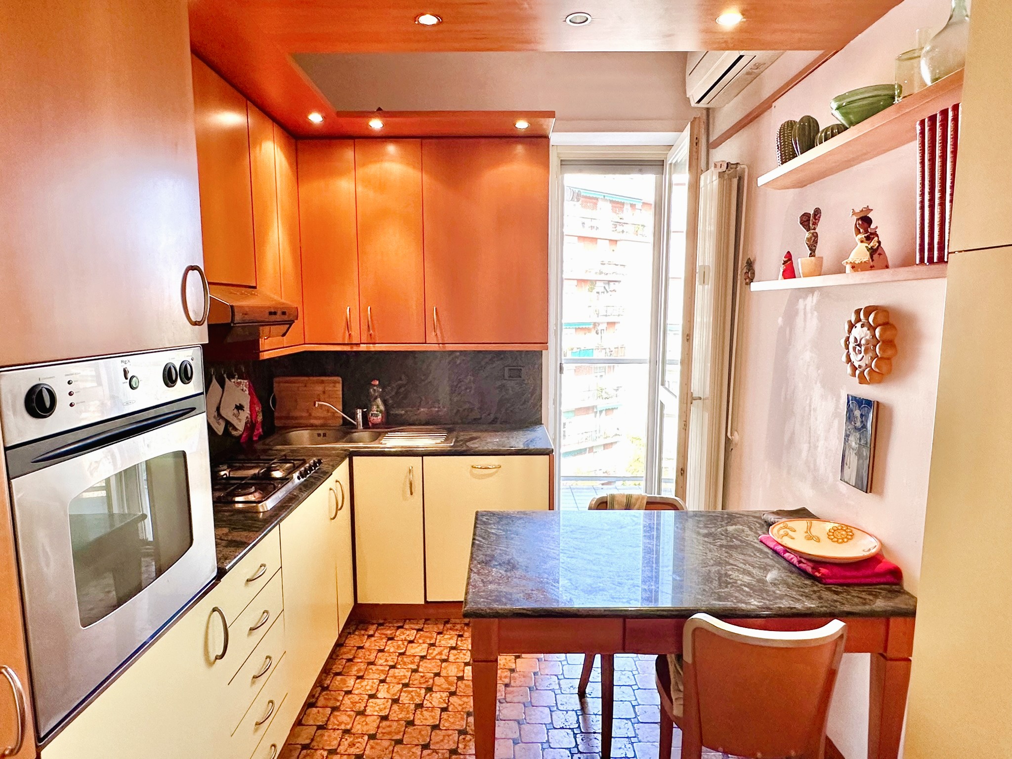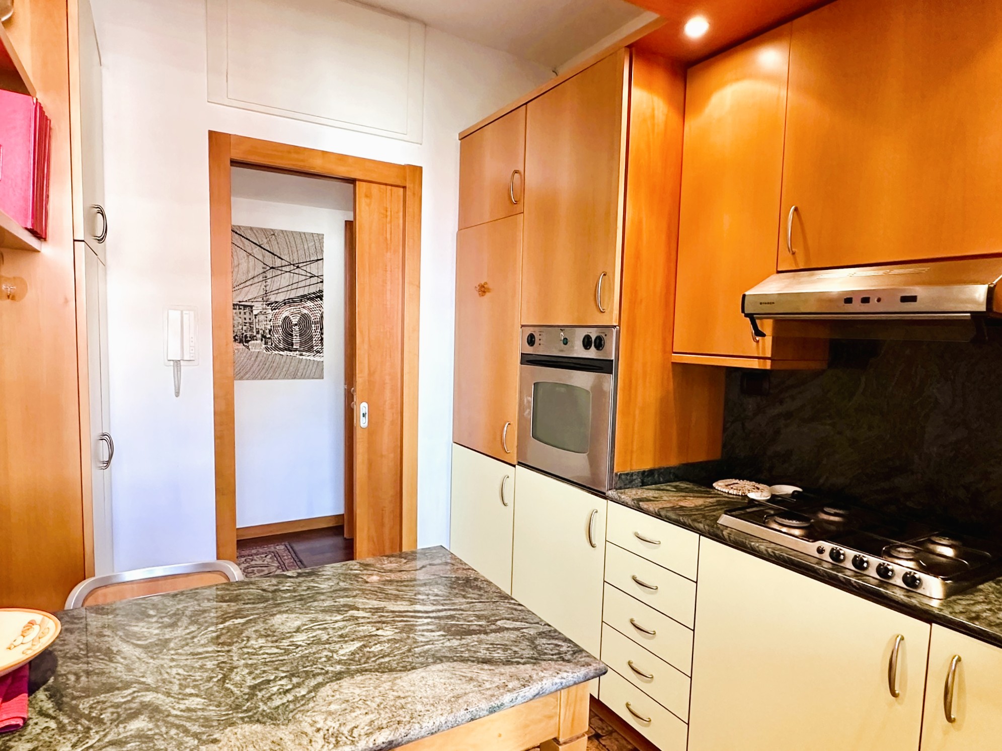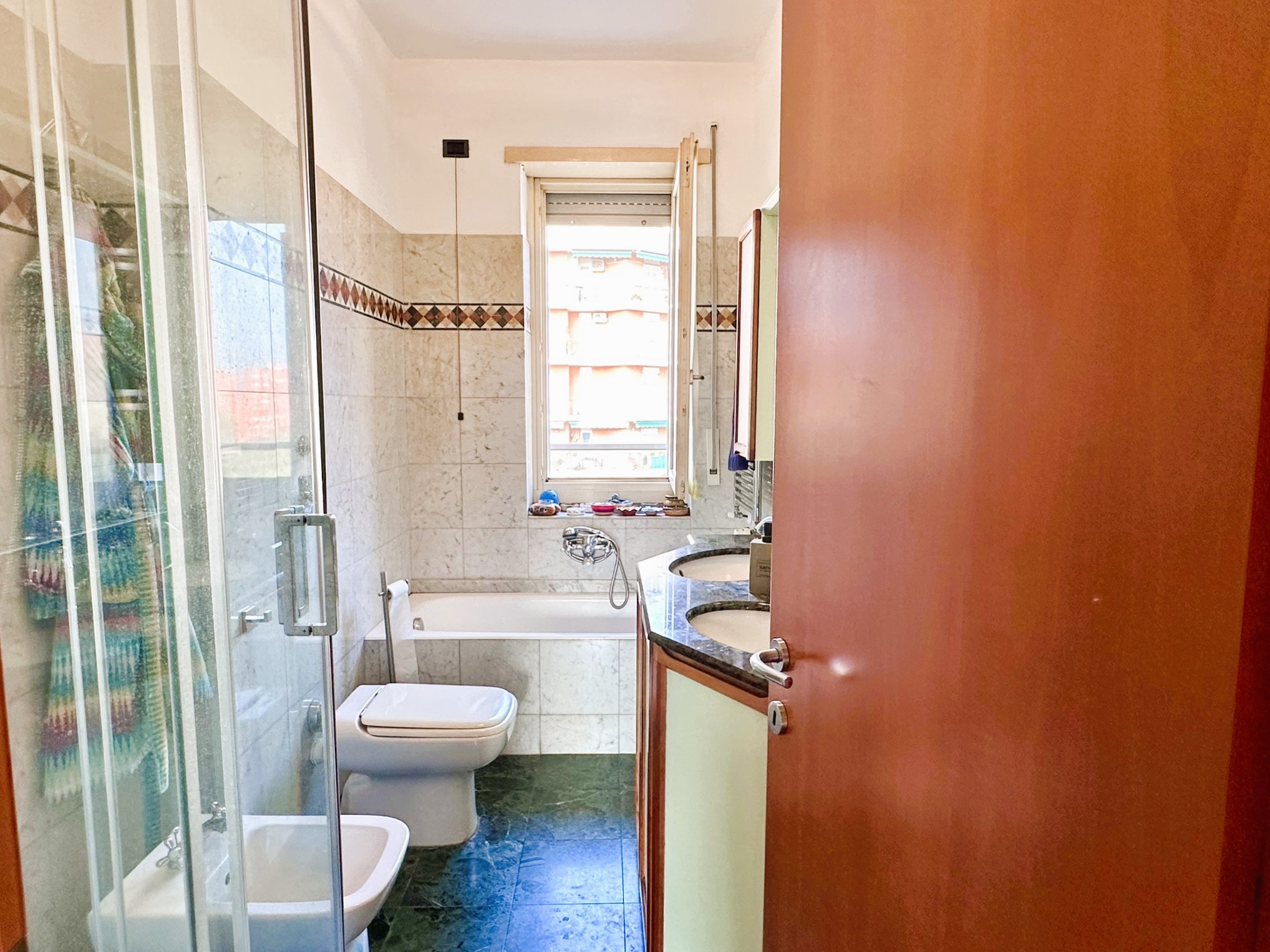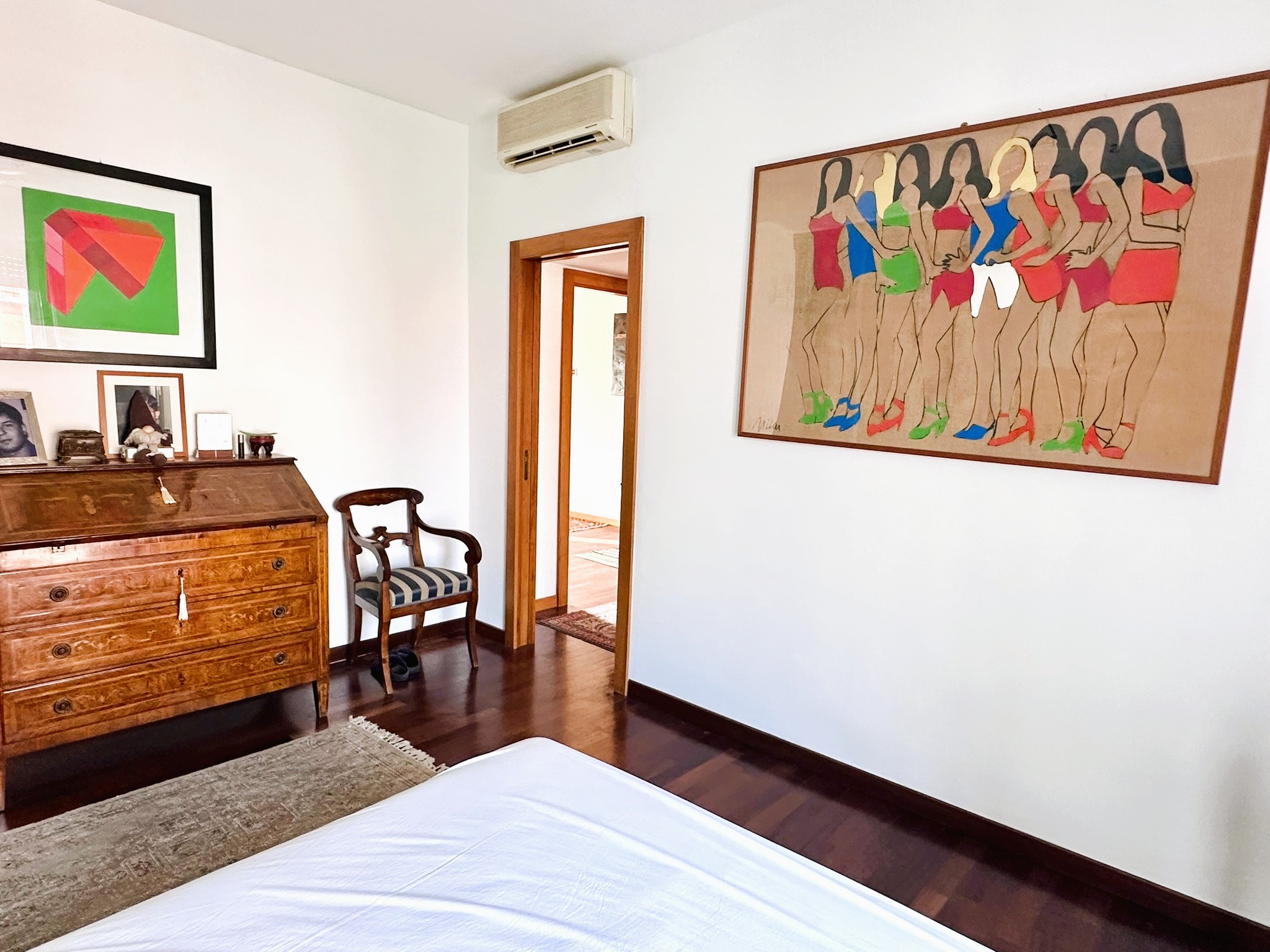 Pavimenti in parquet scuro di tipo Doussié ovunque, ad eccezione del bagno e della cucina dove è presente la ceramica. Scaldabagno elettrico nuovo, infissi esterni in legno con doppi vetri, aria condizionata, porte interne in legno, porta di ingresso blindata.