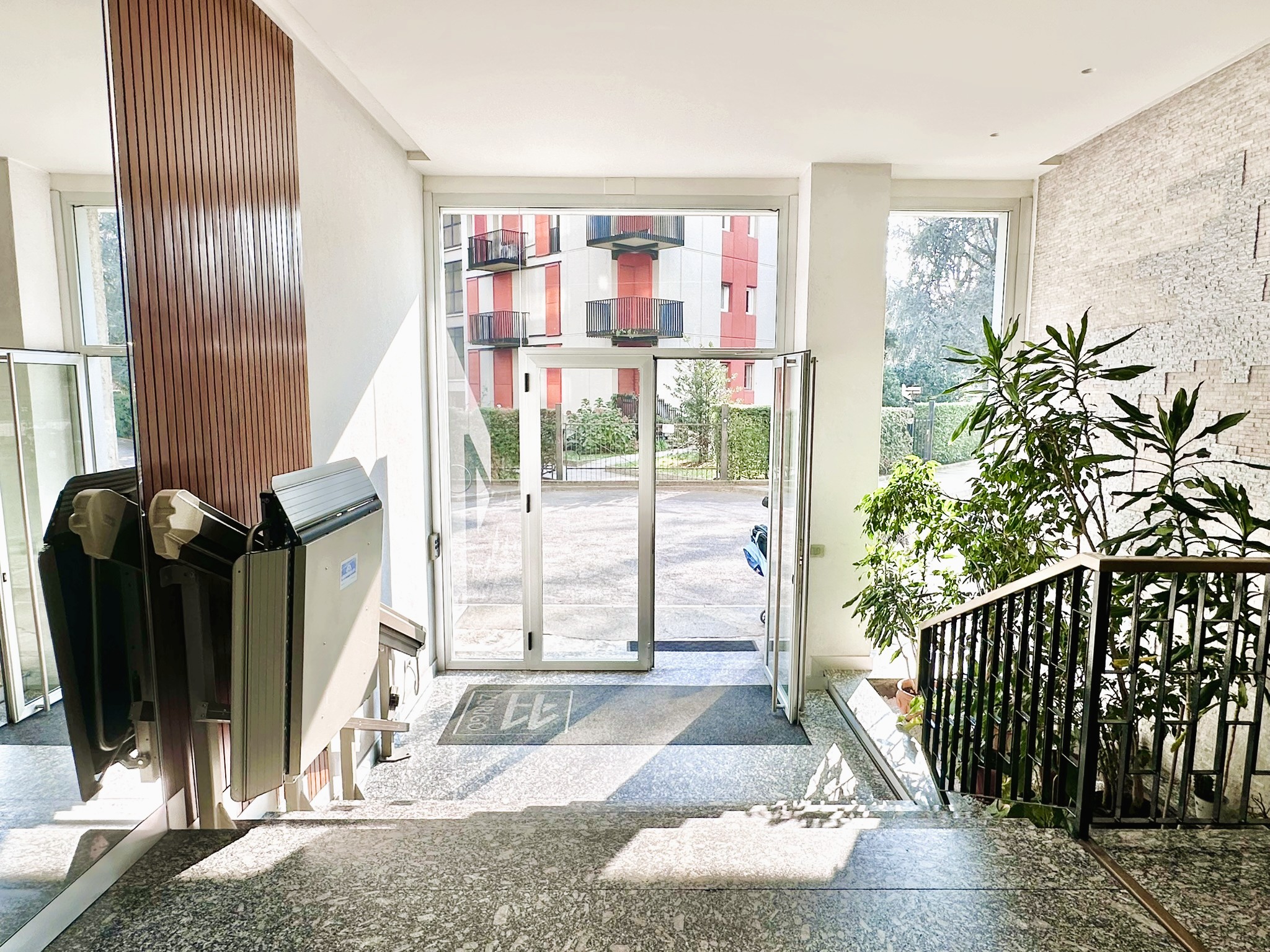 L’immobile ha da un lato una lunga balconata con accesso dalla cucina e dalla camera, che consente di mettere un tavolino con sedie e poter trascorrere piacevoli momenti all’aperto e godere di una vista apertissima con affaccio sul verde; dall’altro lato un comodo balcone che affaccia verso il cortile antistante l’ingresso dell’edificio.